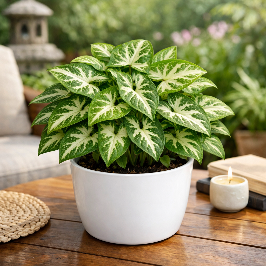 The Dwarf Arrowhead (Syngonium podophyllum ‘Dwarf’) is a compact, evergreen indoor plant known for its arrow-shaped leaves and easy adaptability. It is ideal for homes, offices, and indoor décor spaces due to its air‑purifying properties and low-maintenance nature.